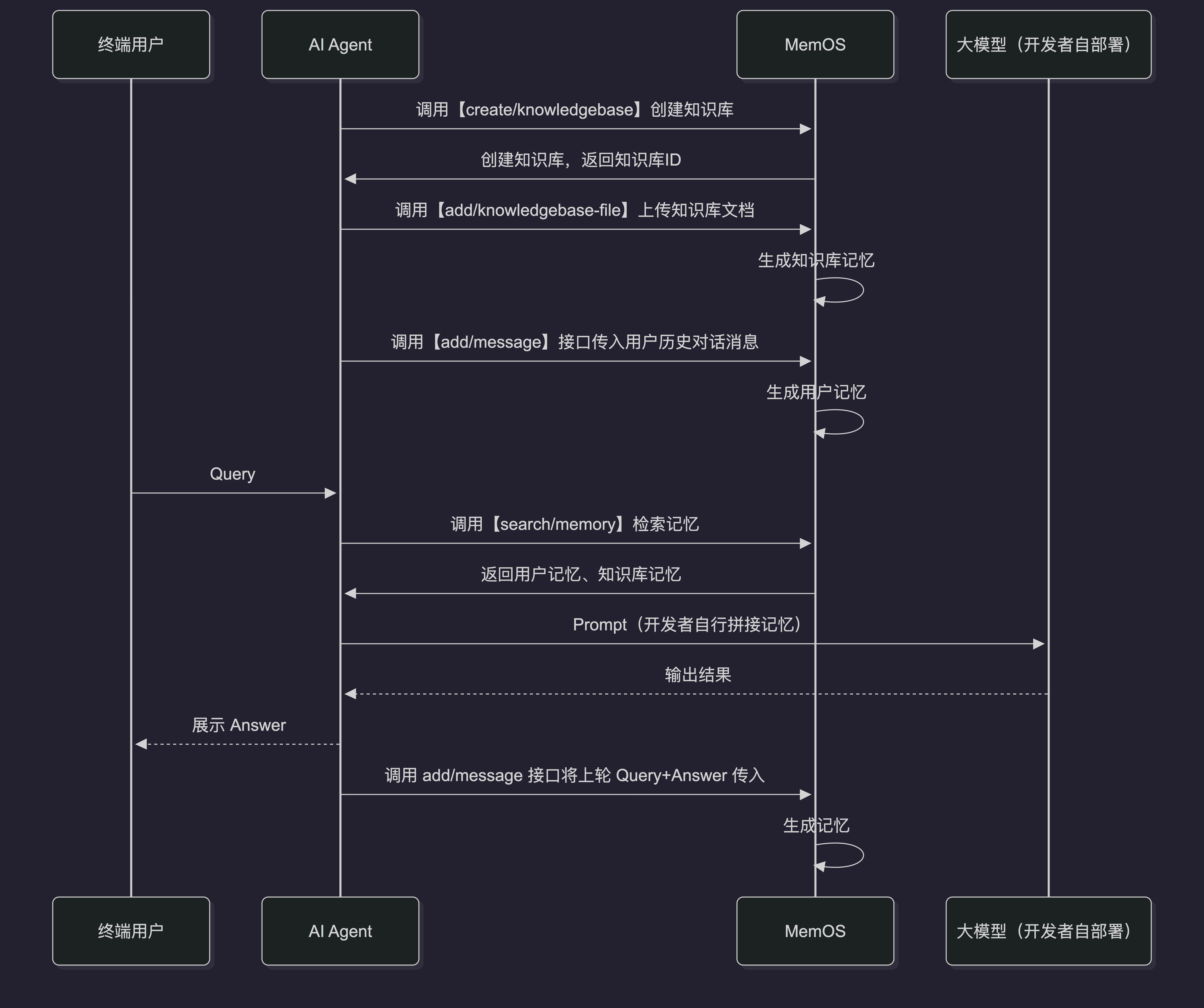 上图展示了终端用户、您构建的 AI Agent 与 MemOS 的完整交互流程: